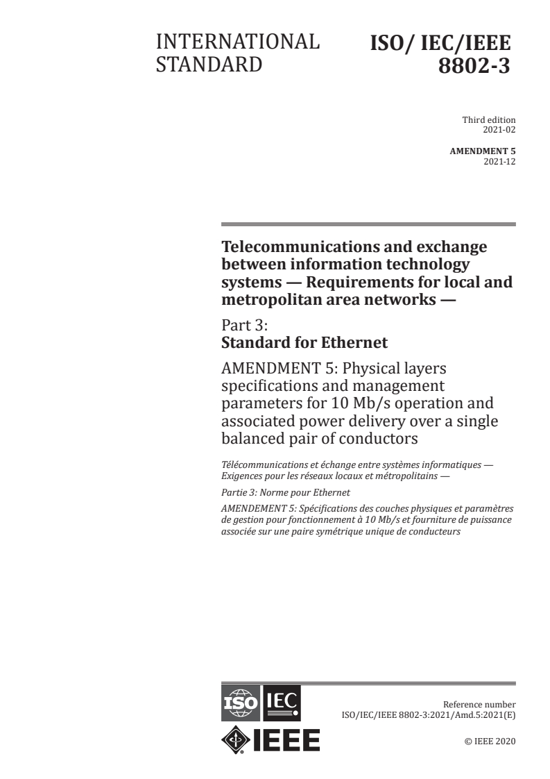 ISO/IEC/IEEE 8802-3:2021/Amd 5:2021 - Telecommunications and exchange between information technology systems — Requirements for local and metropolitan area networks — Part 3: Standard for Ethernet — Amendment 5: Physical layers specifications and management parameters for 10 Mb/s operation and associated power delivery over a single balanced pair of conductors Released:12/15/2021