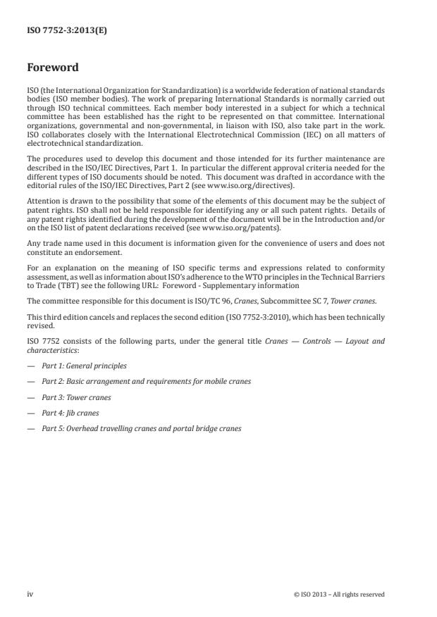 ISO 7752-3:2013 is a standard published by the International Organization for Standardization (ISO). Its full title is "Cranes — Control layout and characteristics — Part 3: Tower cranes". This standard covers: ISO 7752 specifies the particular requirements for controls for tower cranes as defined in ISO 4306‑3 and the arrangement of basic control used for positioning loads.