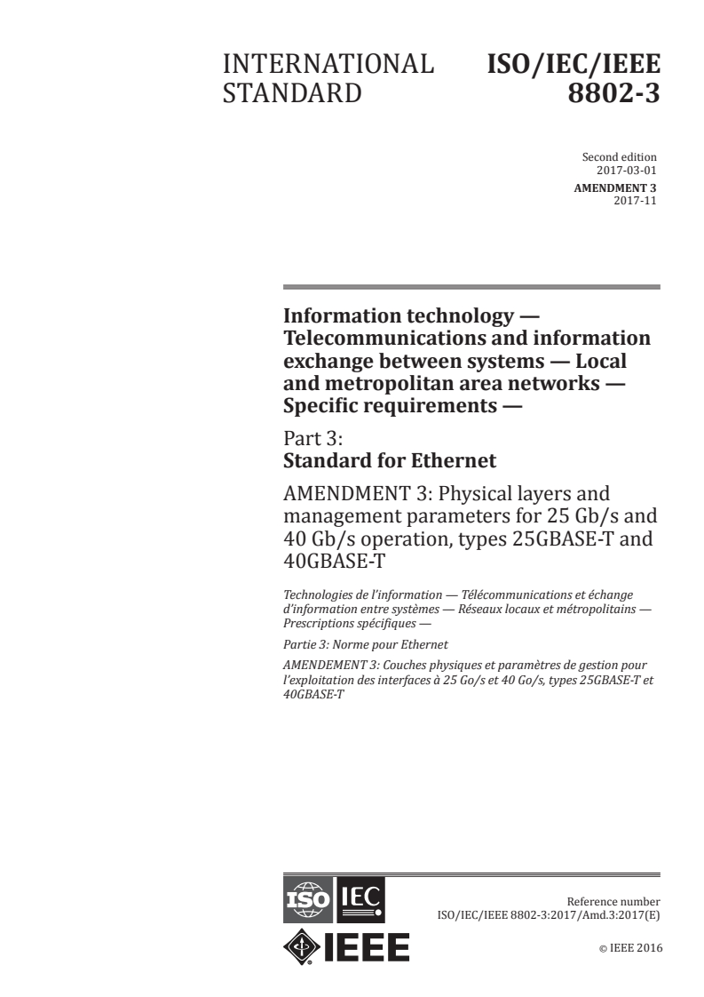 ISO/IEC/IEEE 8802-3:2017/Amd 3:2017 - Information technology — Telecommunications and information exchange between systems — Local and metropolitan area networks — Specific requirements — Part 3: Standard for Ethernet — Amendment 3: Physical layers and management parameters for 25 Gb/s and 40 Gb/s operation, types 25GBASE-T and 40GBASE-T Released:11/29/2017
