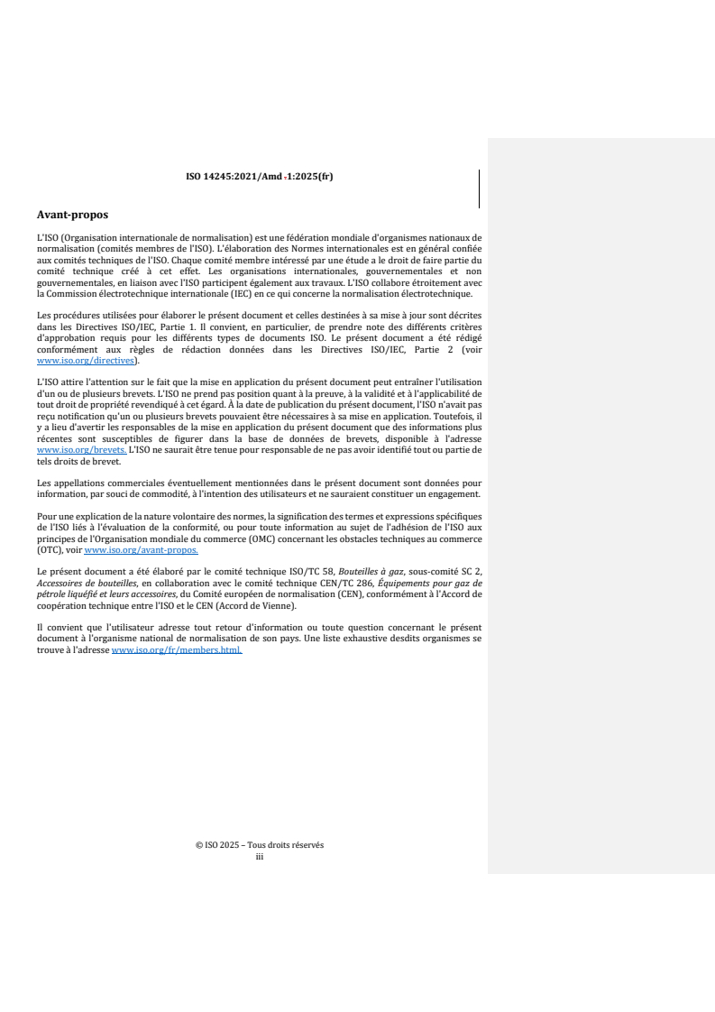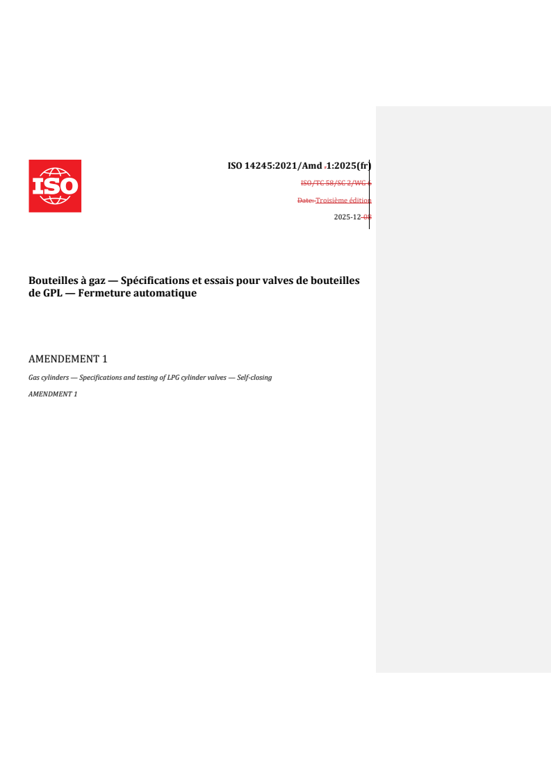 REDLINE ISO 14245:2021/Amd 1:2025 - Bouteilles à gaz — Spécifications et essais pour valves de bouteilles de GPL — Fermeture automatique — Amendement 1 Released:28. 01. 2026
