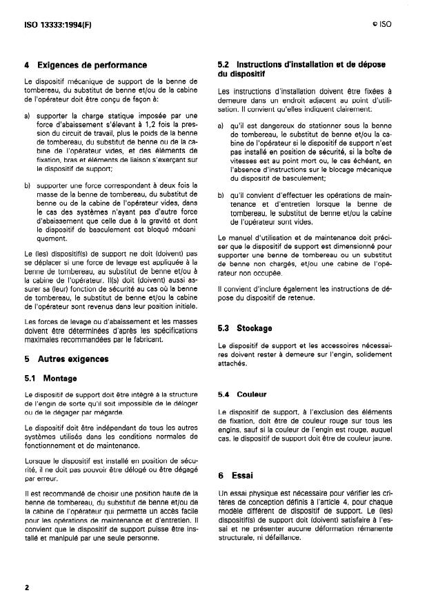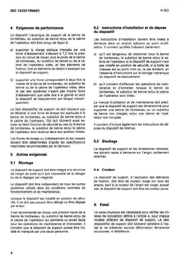 ISO 13333:1994 - Engins de terrassement -- Dispositifs de support de la benne ou de la cabine de l'opérateur en position inclinée