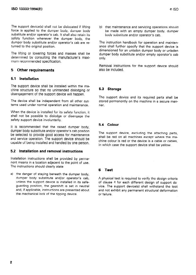 Specifies the performance and test requirements for mechanical support devices for dumper bodies, dumper body substitutes and operator's cabs on earth-moving machines as defined in ISO 6165, equipped with a lift support where it is required that the dumper body, dumper body substitute or operator's cab be held in a raised or tilted position for maintenance, servicing or other non-operational purposes. Also specifies installation instructions, storage and colour requirements for such dumper body and operator cabin tilt support devices.