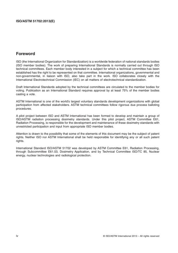 ISO/ASTM 51702:2013 is a standard published by the International Organization for Standardization (ISO). Its full title is "Practice for dosimetry in a gamma facility for radiation processing". This standard covers: ISO/ASTM 51702:2013 outlines the installation qualification program for an irradiator and the dosimetric procedures to be followed during operational qualification, performance qualification, and routine processing in facilities that process products with ionizing radiation from radionuclide gamma sources to ensure that product has been treated within a predetermined range of absorbed dose. Other procedures related to operational qualification, performance qualification, and routine processing that may influence absorbed dose in the product are also discussed. NOTE 1 Dosimetry is only one component of a total quality assurance program for adherence to good manufacturing practices used in radiation processing applications. NOTE 2 ISO/ASTM Practices 51818 and 51649 describe dosimetric procedures for low and high enery electron beam facilities for radiation processing and ISO/ASTM Practice 51608 describes procedures for X-ray (bremsstrahlung) facilities for radiation processing.