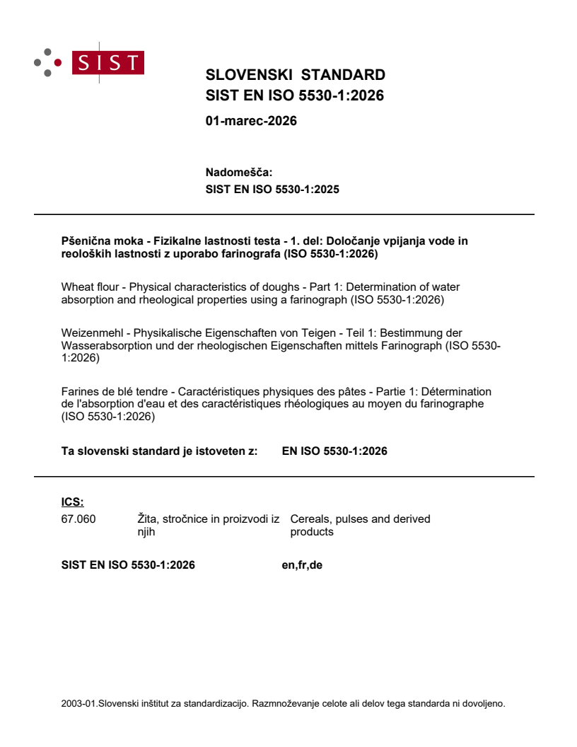 SIST EN ISO 5530-1:2026 is a standard published by the Slovenian Institute for Standardization (SIST). Its full title is "Wheat flour - Physical characteristics of doughs - Part 1: Determination of water absorption and rheological properties using a farinograph (ISO 5530-1:2026)". This standard covers: This document specifies a method using a farinograph for the determination of the water absorption of flours and the mixing behaviour of doughs made from them by a constant flour mass procedure or by a constant dough mass procedure. The method is applicable to experimental and commercial flours from wheat (Triticum aestivum L.). NOTE This document is related to ICC 115/1[5] and AACC Method 54-21.02[6].