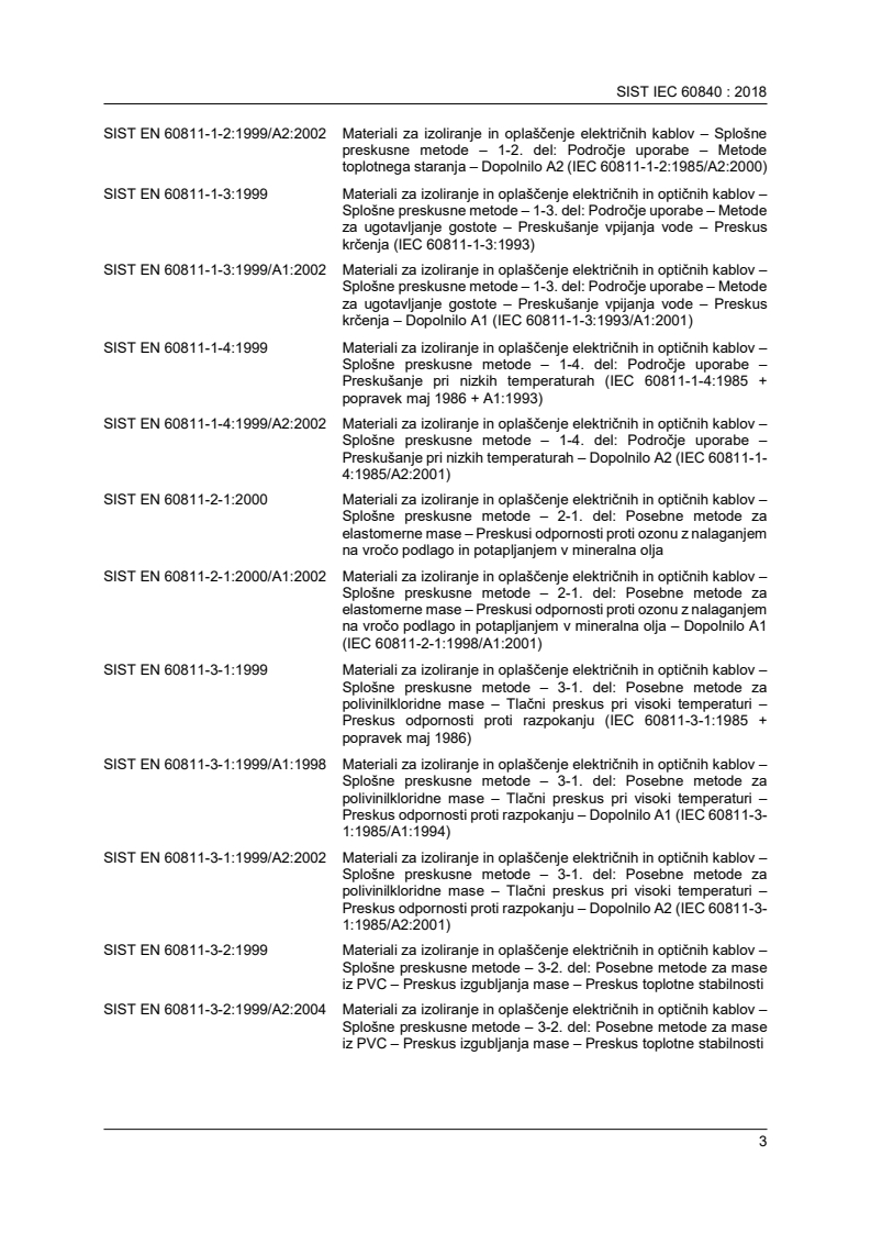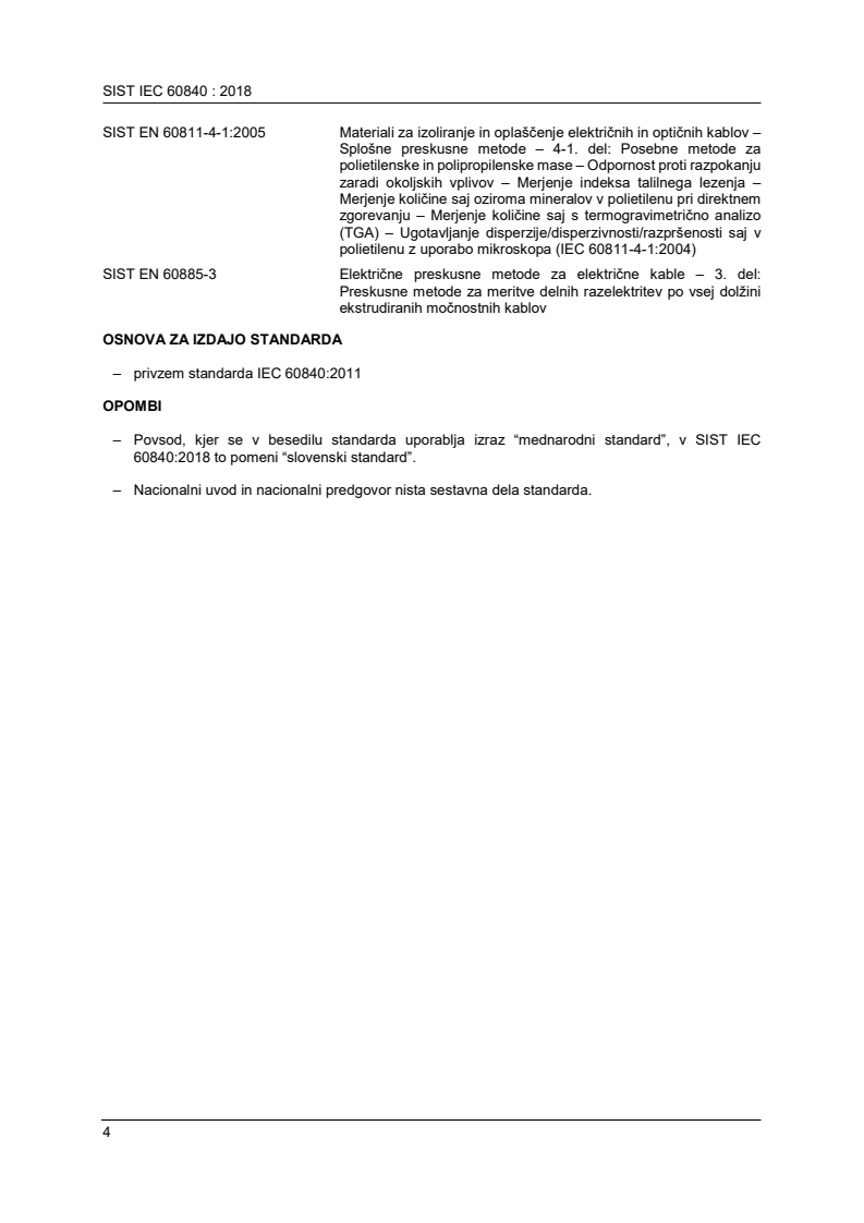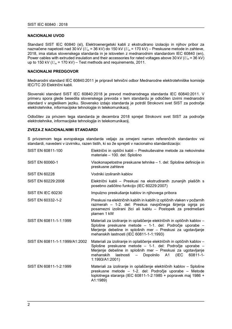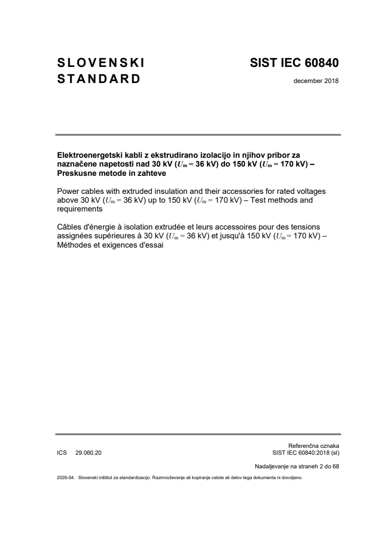 SIST IEC 60840:2018 is a standard published by the Slovenian Institute for Standardization (SIST). Its full title is "Power cables with extruded insulation and their accessories for rated voltages above 30 kV (Um = 36 kV) up to 150 kV (Um = 170 kV) - Test methods and requirements". This standard covers: IEC 60840:2011 is available as <a href='https://webstore.iec.ch/publication/22264'>IEC 60840:2011 RLV</a> which contains the International Standard and its Redline version, showing all changes of the technical content compared to the previous edition.<br /><br /> IEC 60840:2011 specifies test methods and requirements for power cable systems, cables alone and accessories alone, for fixed installations and for rated voltages above 30 kV (<i>U</i><sub>m</sub> = 36 kV) up to and including 150 kV (<i>U</i><sub>m</sub> = 170 kV). The requirements apply to single-core cables and to individually screened three-core cables and to their accessories for usual conditions of installation and operation, but not to special cables and their accessories, such as submarine cables, for which modifications to the standard tests may be necessary or special test conditions may need to be devised. This standard does not cover transition joints between cables with extruded insulation and paper insulated cables. The significant technical change with respect to the previous edition is as follows:<br /> - introduction of a prequalification test procedure for cables with high electrical stresses and tested as a cable system including accessories.<br /> NOTE: For a more detailed history of events leading up to this fourth edition, see the Introduction.