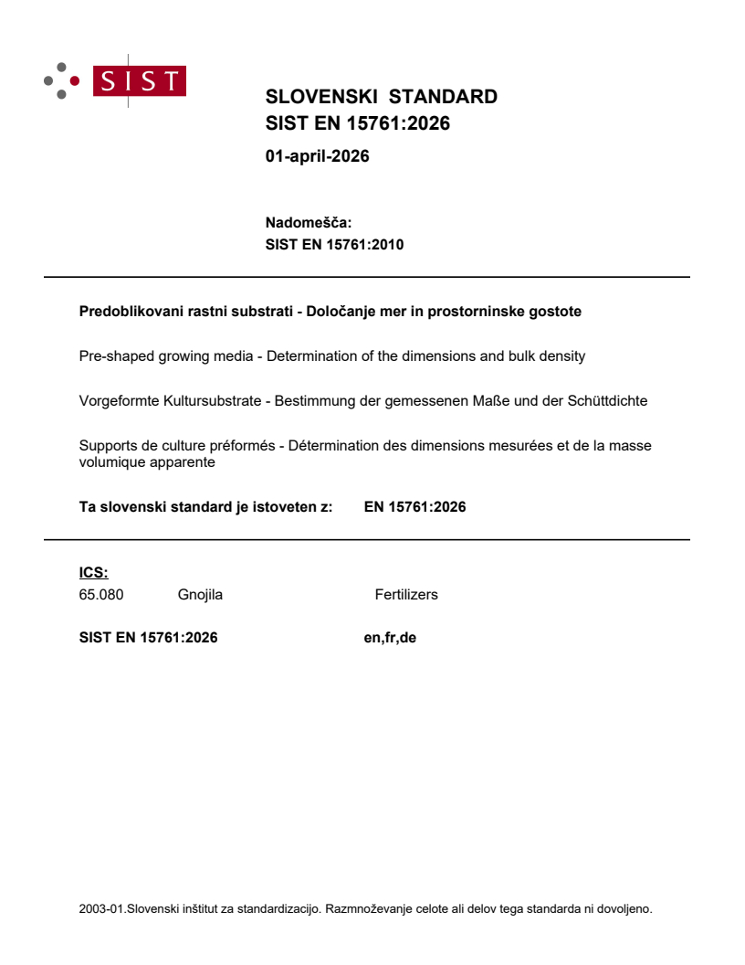 SIST EN 15761:2026 is a standard published by the Slovenian Institute for Standardization (SIST). Its full title is "Pre-shaped growing media - Determination of the dimensions and bulk density". This standard covers: This document specifies a method for the determination of the dimensions and of the bulk density of pre-shaped growing media. In this document, "pre-shaped growing media": - includes solid, regular shaped, stable growing media sold, or which are ready for use, as a growing medium, where the dimensions and any corners are stable; - excludes plugs; NOTE For the determination of the dimensions and the bulk density of plugs, EN 18250:- applies [1]. - excludes solid growing media that has to be hydrated for it to form, varies in dimension with varying water content - for example, coir or peat slabs or growing bags.