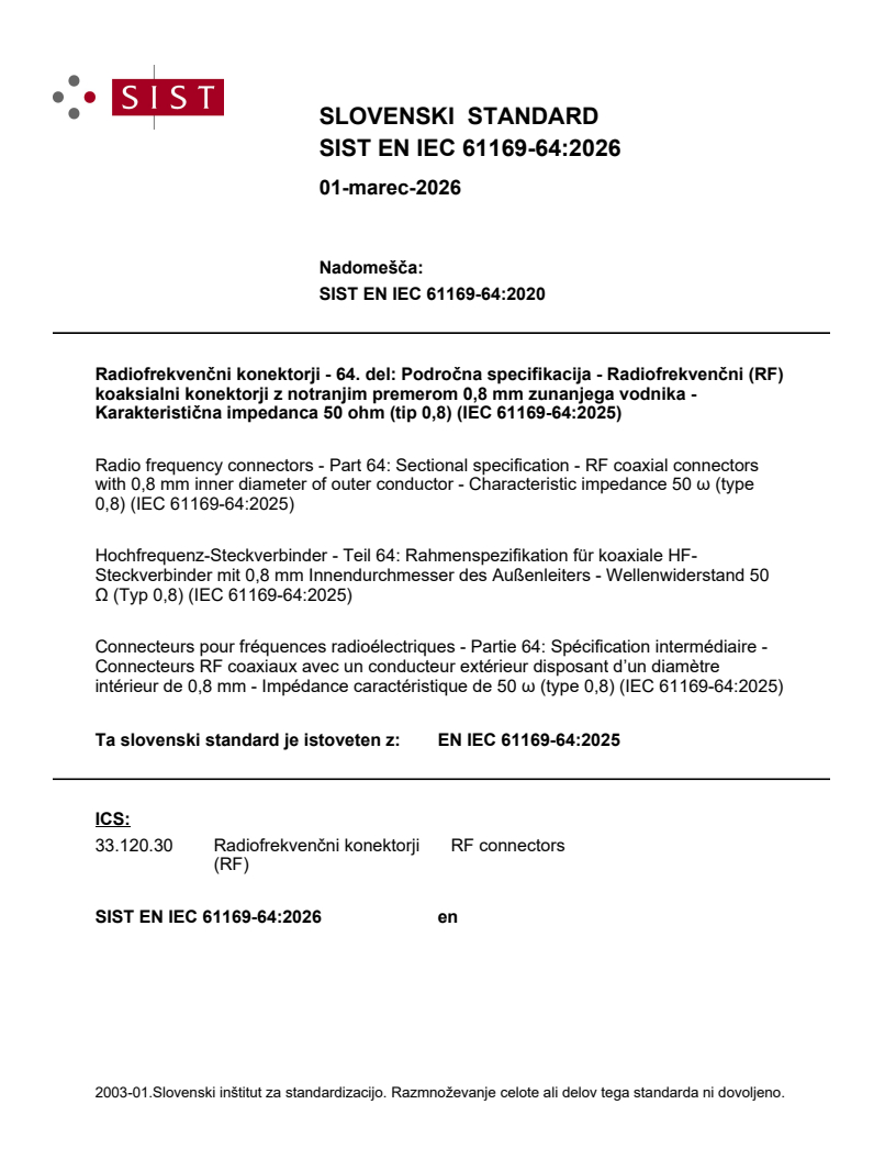 SIST EN IEC 61169-64:2026 is a standard published by the Slovenian Institute for Standardization (SIST). Its full title is "Radio frequency connectors - Part 64: Sectional specification - RF coaxial connectors with 0,8 mm inner diameter of outer conductor - Characteristic impedance 50 ω (type 0,8) (IEC 61169-64:2025)". This standard covers: IEC 61169-64:2025, which is a sectional specification (SS), provides information for the preparation of detail specifications (DS) for coaxial connectors with 0,8 mm inner diameter of the outer conductor, characteristic impedance of 50 Ω, and with screw coupling. These connectors are referred to below as type 0,8 connectors. They are used in telecommunications technology as well as in test and measurement applications for operating frequencies up to 145 GHz. This document describes mating face dimensions for high performance connectors (grade 1) and standard test connectors (grade 0), gauging information and tests selected from IEC 61169-1, applicable to all detail specifications relating to type 0,8 connectors. This document indicates the recommended performance characteristics to consider when writing a detail specification and it covers test schedules and inspection requirements for assessment levels M and H. This second edition cancels and replaces the first edition published in 2019. This edition constitutes a technical revision. This edition includes the following significant technical changes with respect to the previous edition: a) upgrading of the inferior connector class to a grade 1 “high performance connector”; b) alignment of the mating face dimensions as well as the ratings and characteristics with the precision 0,8 mm connectors specified in the IEEE 287.1-2021 and IEEE 287.3-2021 standards; c) figures: true-to-scale design; change of datum system for tolerances; introduction of an additional dimension; d) gauge pins: correction of dimensions and test procedures; e) simplification of the clauses on quality assessment (Clause 5), preparation of a detail specification (Clause 6), and marking (Clause 7) by making direct reference to the generic specification IEC 61169-1; f) introduction of an optional design for the coupling nut.
