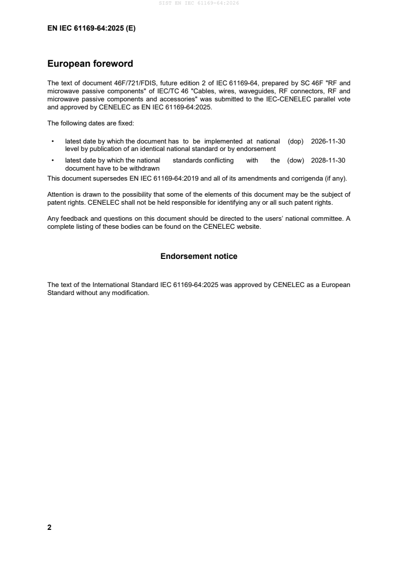 IEC 61169-64 has been prepared by subcommittee 46F: RF and microwave passive