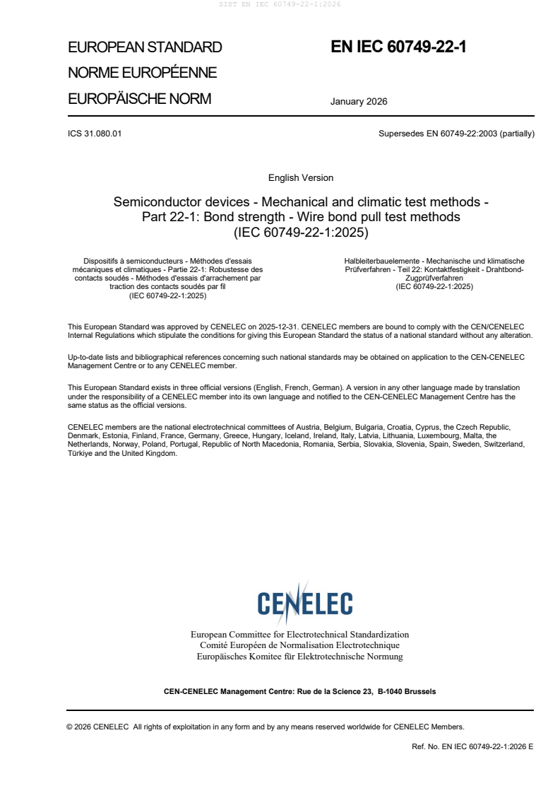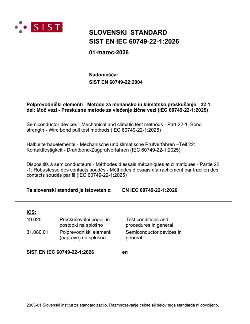 SIST EN IEC 60749-22-1:2026 is a standard published by the Slovenian Institute for Standardization (SIST). Its full title is "Semiconductor devices - Mechanical and climatic test methods - Part 22-1: Bond strength - Wire bond pull test methods (IEC 60749-22-1:2025)". This standard covers: IEC 60749-22-1:2025 provides a means for determining the strength and failure mode of a wire bonded to, and the corresponding interconnects on, a die or package bonding surface and can be performed on unencapsulated or decapsulated devices. This test method can be performed on gold alloy, copper alloy, and silver alloy thermosonic (ball and stitch) bonds made of wire ranging in diameter from 15 µm to 76 µm (0,000 6" to 0,003"); and on gold alloy, copper alloy, and aluminium alloy ultrasonic (wedge) bonds made of wire ranging in diameter from 18 µm to 600 µm (0,000 7" to 0,024"). This wire bond pull test method is destructive. It is appropriate for use in process development, process control, or quality assurance. This test method allows for two distinct methods of pulling wires: a) One method incorporates the use of a hook that is placed under the wire and is then pulled. b) One method requires that after the wire be cut, a clamp is placed on the wire connected to the bond to be tested, and this clamp is used to pull the wire. This test method does not include bond strength testing using wire bond shear testing. Wire bond shear testing is described in IEC 60749-22-2. This first edition, together with the first edition of IEC 60749-22-2:2025, cancels and replaces the first edition of IEC 60749-22 published in 2002. This edition includes the following significant technical changes with respect to the previous edition: a) Major update, including new techniques and use of new materials (e.g. copper wire) involving a complete rewrite as two separate subparts (this document and IEC 60749-22-2). This International Standard is to be used in conjunction with IEC 60749-22-2:2025.