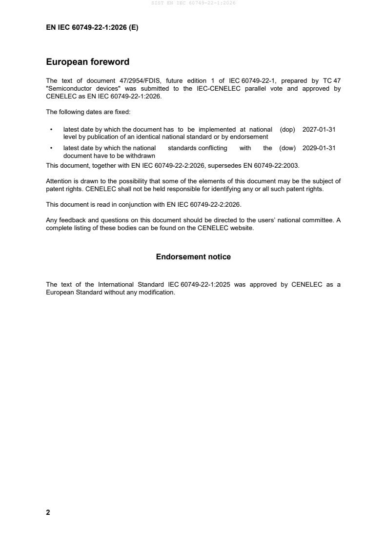 SIST EN IEC 60749-22-1:2026 is available in PDF format for immediate download after purchase. The document can be added to your cart and obtained through the secure checkout process. Digital delivery ensures instant access to the complete standard document.