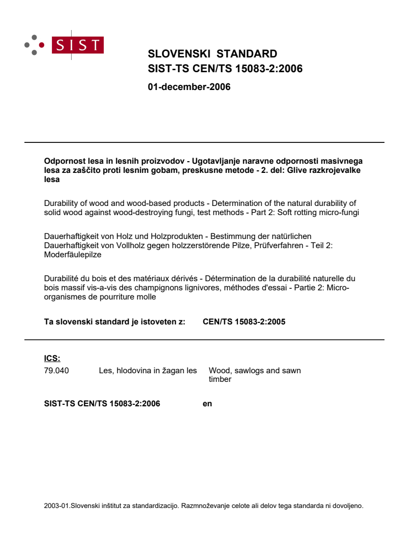 SIST-TS CEN/TS 15083-2:2006 is a technical specification published by the Slovenian Institute for Standardization (SIST). Its full title is "Durability of wood and wood-based products - Determination of the natural durability of solid wood against wood-destroying fungi, test methods - Part 2: Soft rotting micro-fungi". This standard covers: This CEN Technical Specification specifies a method of test for determining the natural durability of a timber against soft rotting micro-fungi. The method is applicable to all timber species. NOTE This method may be used in conjunction with an ageing procedure, for example EN 73 or EN 84.