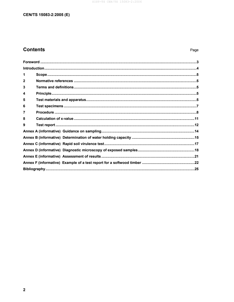 CEN/TS 15083-2:2005 defines a laboratory test method for determining the natural durability of solid wood against soft rotting micro-fungi (soft rot). Published by CEN/TC 38, this Technical Specification applies to all timber species and gives a reproducible procedure to expose wood specimens to soil-borne micro-flora and assess attack by soft rotting fungi. The method can be combined with ageing procedures (for example EN 73 or EN 84) to simulate field-relevant conditions.