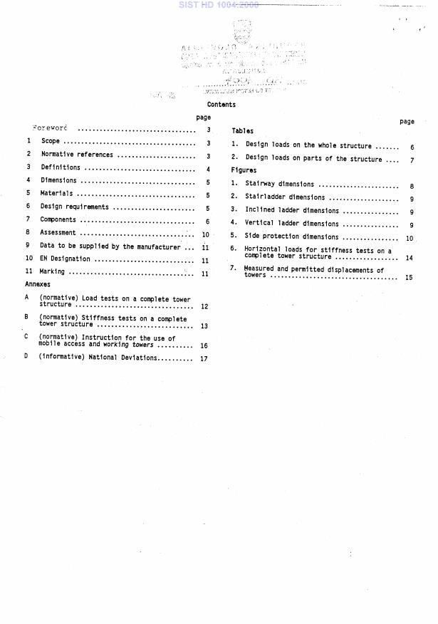 SIST HD 1004:2000 is a standardization document published by the Slovenian Institute for Standardization (SIST). Its full title is "Mobile access and working towers made of prefabricated elements - Materials, dimensions, design loads and safety requirements". This standard covers: This Harmonization Document applies to the design and manufacture of mobile access and working towers made of prefabricated elements with a height from 2,5 m to 12,0 m (indoors) and from 2,5 m to 8,0 m outdoors. This Harmonization Document gives guidelines for the choice of the main dimensions and stabilizing methods, specifies properties for the materials used, gives safety requirements and gives some information on complete towers and their manual relocation.