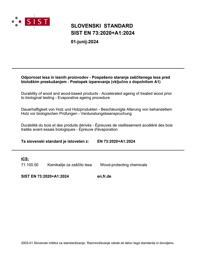 Keywords: Durability of wood, wood preservatives, evaporative ageing, accelerated ageing, treated wood testing, biological testing of wood, wood-based products, wood modification, wood durability standards, CEN standards, SIST EN 73:2020+A1:2024, wood preservative volatilization, pre-conditioning of wood, laboratory ageing procedures.