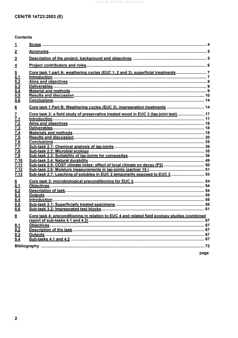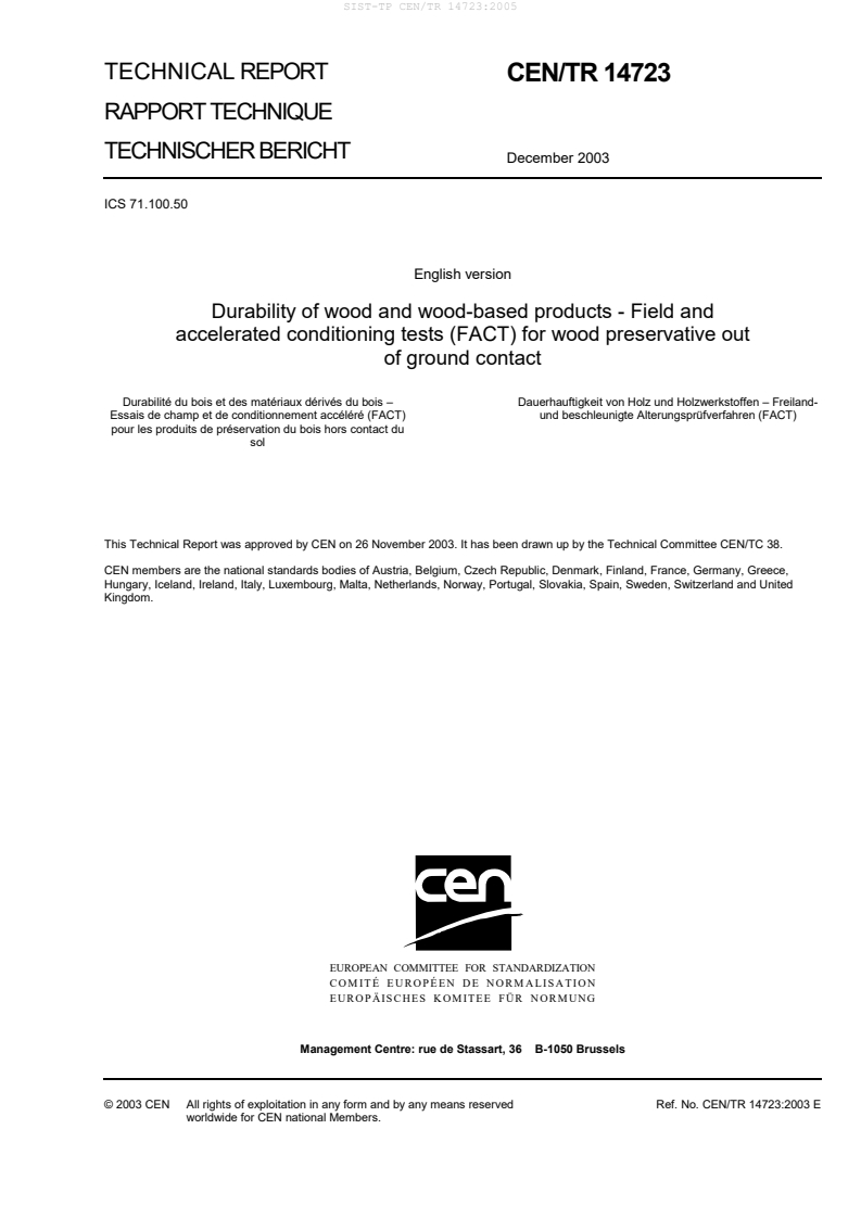Keywords: CEN/TR 14723:2003, durability of wood, FACT tests, field and accelerated conditioning tests, wood preservative out of ground contact, wood‑protecting chemicals, durability testing.
