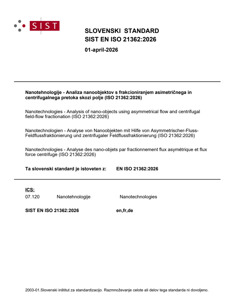 SIST EN ISO 21362:2026 is a standard published by the Slovenian Institute for Standardization (SIST). Its full title is "Nanotechnologies - Analysis of nano-objects using asymmetrical flow and centrifugal field-flow fractionation (ISO 21362:2026)". This standard covers: This document describes the general principles of field-flow fractionation and specifies parameters, conditions and minimal reporting requirements, as part of an integrated measurement system, required to develop and validate methods for the application of asymmetrical flow and centrifugal field-flow fractionation in the analysis of nano-objects and their aggregates and agglomerates in aqueous media. General guidelines and procedures are provided to aid the user.