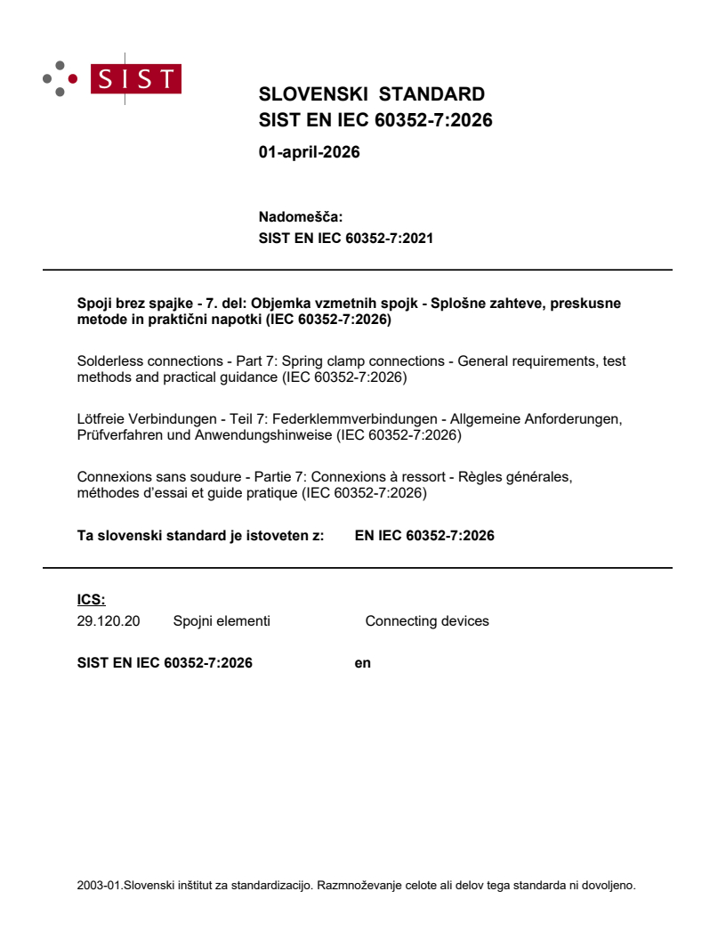 SIST EN IEC 60352-7:2026 is a standard published by the Slovenian Institute for Standardization (SIST). Its full title is "Solderless connections - Part 7: Spring clamp connections - General requirements, test methods and practical guidance (IEC 60352-7:2026)". This standard covers: This part of IEC 60352 is applicable to spring clamp connections made with stripped wire of the following types and sizes according to IEC 60228 or IEC 60189-3, without further preparation (later described “unprepared”): – solid conductors (e.g. class 1 of IEC 60228) of 0,32 mm to 3,7 mm nominal diameter (0,08 mm2 to 10 mm2 cross-section), or – stranded conductors (e.g. class 2 of IEC 60228) of 0,08 mm2 to 10 mm2 cross-section, or – flexible conductors (e.g. class 5 or 6 of IEC 60228) of 0,08 mm2 to 10 mm2 cross-section, for use in electrical and electronic equipment and components. Information on materials and data from industrial experience is included in addition to the test procedures to provide electrically stable connections under prescribed environmental conditions. The object of this document is to determine the suitability of spring clamp connections under specified mechanical, electrical and atmospheric conditions. NOTE IEC Guide 109 advocates the need to minimize the impact of a product on the natural environment throughout the product life cycle. It is understood that some of the materials permitted in this document can have a negative environmental impact. As technological advances lead to acceptable alternatives for these materials, they will be eliminated from this document.