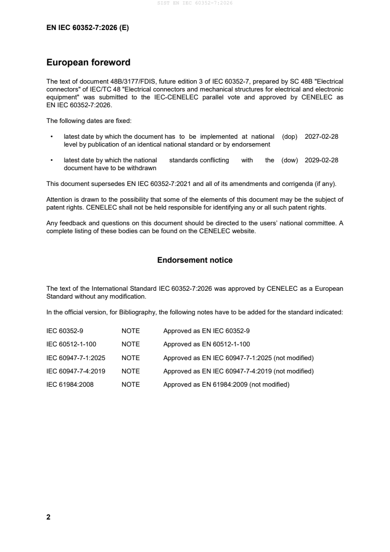 SIST EN IEC 60352-7:2026 has the following relationships with other standards: It is inter standard links to SIST EN IEC 60352-7:2021, SIST EN 60512-16-20:2002, SIST EN IEC 60228:2024, SIST EN 60512-2-5:2004, SIST EN 60512-11-10:2003, SIST EN 60512-1-1:2003, SIST EN IEC 60512-9-5:2020, SIST EN IEC 60512-11-1:2019, SIST EN 60512-11-4:2003, SIST EN IEC 60512-1:2019, SIST EN 60512-11-7:2004, SIST EN 60068-1:2014, SIST EN 60512-11-9:2003, SIST EN 60512-2-1:2003, SIST EN 60512-1-2:2003. Understanding these relationships helps ensure you are using the most current and applicable version of the standard.