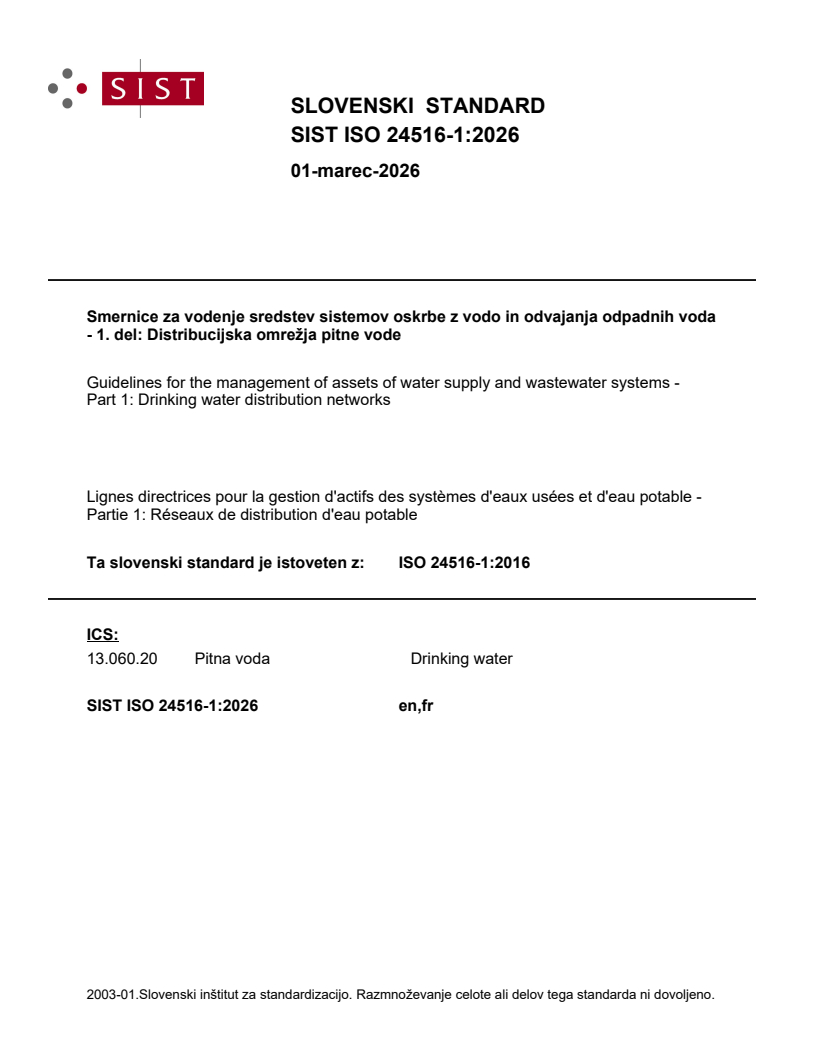 SIST ISO 24516-1:2026 is a standard published by the Slovenian Institute for Standardization (SIST). Its full title is "Guidelines for the management of assets of water supply and wastewater systems - Part 1: Drinking water distribution networks". This standard covers: ISO 24516-1:2016 specifies guidelines for technical aspects, tools and good practices for the management of assets of drinking water networks to maintain value from existing assets. ISO 24516-1:2016 does not apply to the management of assets of waterworks (including catchment and treatment, pumping and storage in the network), which are also physically part of the drinking water system and can influence the management of assets of the pipe network. ISO 24516-1:2016 focuses on the assets typically owned or operated by drinking water utilities (networked drinking water systems) that are expected to meet customer needs and expectations over longer (multi-generational) periods. ISO 24516-1:2016 includes examples for good practice approaches on the strategic, tactical and operational levels. ISO 24516-1:2016 is applicable to all types and sizes of organization and/or utilities operating drinking water systems, and all different roles/functions for the management of assets within a utility (e.g. asset owner/responsible body, asset manager/operator, service provider/operator).
