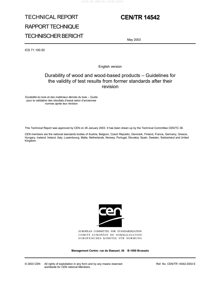 This document CEN/TR 14542:2003 has been prepared by Technical Committee CEN/TC 38 “Durability of wood
