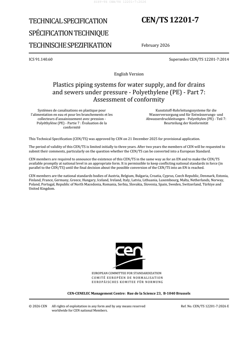 SIST-TS CEN/TS 12201-7:2026 is available in PDF format for immediate download after purchase. The document can be added to your cart and obtained through the secure checkout process. Digital delivery ensures instant access to the complete standard document.