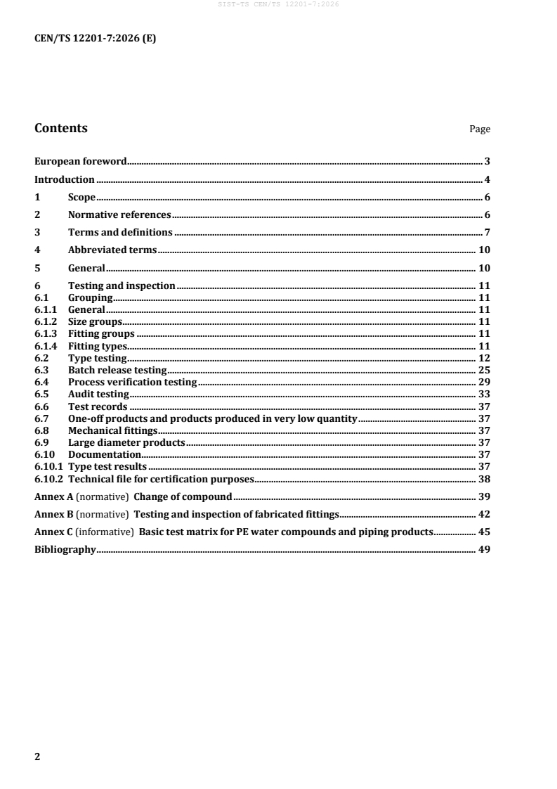 SIST-TS CEN/TS 12201-7:2026 is a technical specification published by the Slovenian Institute for Standardization (SIST). Its full title is "Plastics piping systems for water supply, and for drains and sewers under pressure - Polyethylene (PE) - Part 7: Assessment of conformity". This standard covers: This document gives guidance and requirements for the assessment of conformity of compounds, products, joints and assemblies in accordance with the applicable part(s) of EN 12201 intended to be included in the manufacturer’s quality plan as part of the quality management system and for the establishment of certification procedures. NOTE 1 A test matrix provides an overview of the testing scheme in Annex C, Table C.1. NOTE 2 If certification is involved, the certification bodies and inspection bodies operating in accordance with EN ISO/IEC 17065 [6] and EN ISO/IEC 17020 [4] are considered to be competent. Socket fusion fittings according to EN 12201 3:2024, Annex A, and mechanical fittings according to ISO 17885 are not covered in this document. In conjunction with EN 12201 1, EN 12201 2, EN 12201 3, EN 12201 4 and EN 12201 5, this document is applicable to polyethylene (PE) pressure piping systems (mains and service pipes) for buried or above ground applications, intended for the conveyance of water for human consumption, raw water prior to treatment, drains and sewers under pressure, vacuum sewer systems, and water for other purposes, with the exception of industrial application. The intended use includes sea outfalls, laid in water and pipes suspended below bridges. It is applicable to PE pipes, fittings, and valves, their joints and joints with components of PE and other materials intended to be used under the following conditions: a) allowable operating pressure, PFA, up to 25 bar ; b) an operating temperature of 20 °C as a reference temperature. NOTE 3 Industrial application is covered by EN ISO 15494 [3]. NOTE 4 For applications operating at constant temperature greater than 20 °C and up to and including 50 °C, see EN 12201 1:2024, Annex A. NOTE 5 It is the responsibility of the purchaser or specifier to make the appropriate selections from these aspects, taking into account their particular requirements and any relevant national guidance or regulations and installation practices or codes.